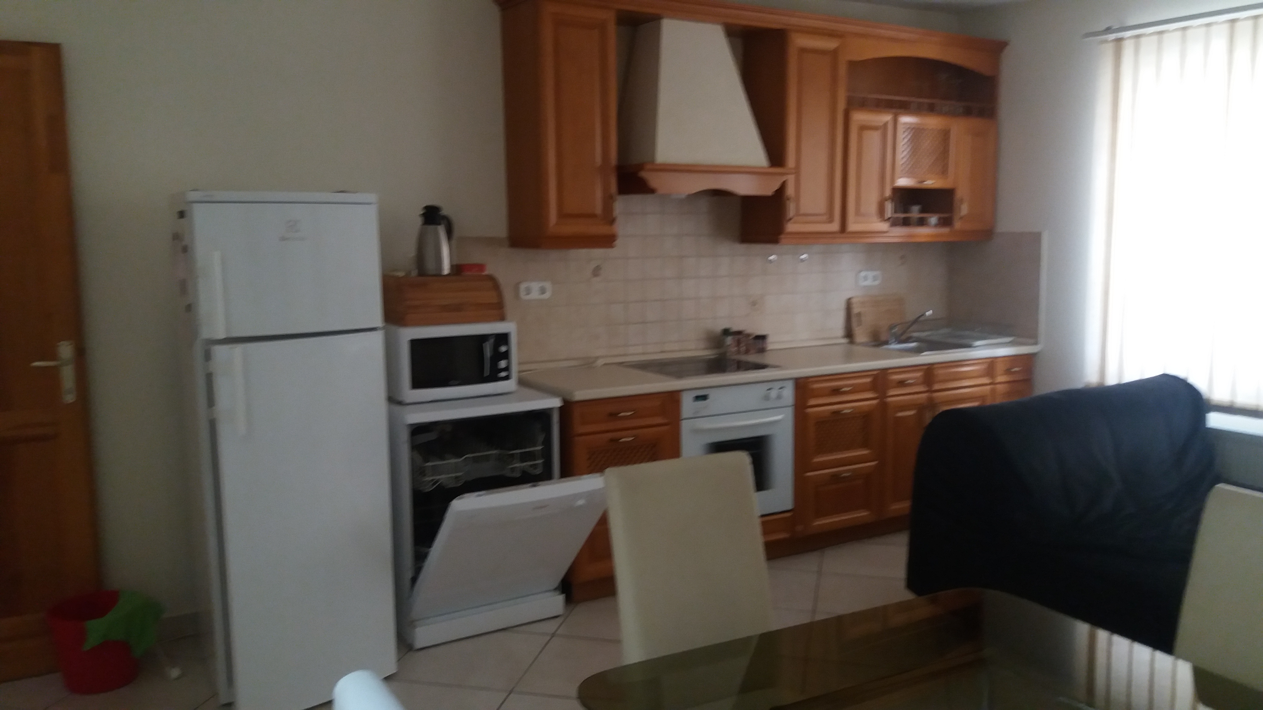 Kitchen: cherry wood furniture, built-in dishwasher